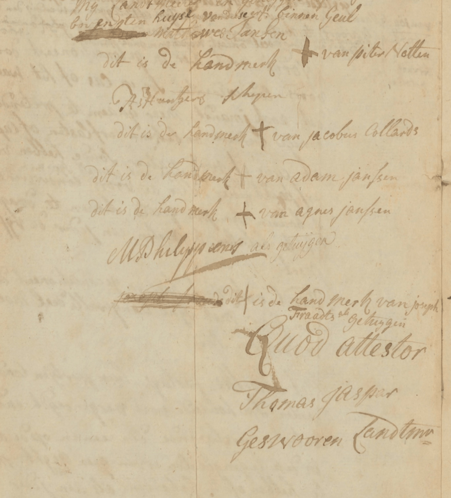 Dit is het einde van de akte van de landmeter met allemaal kruisjes achter hun naam, alleen een van de getuigen en de landmeter ondertekenen met naam. Thomas Jaspers uit Ulestraten een geswooren landmeter.