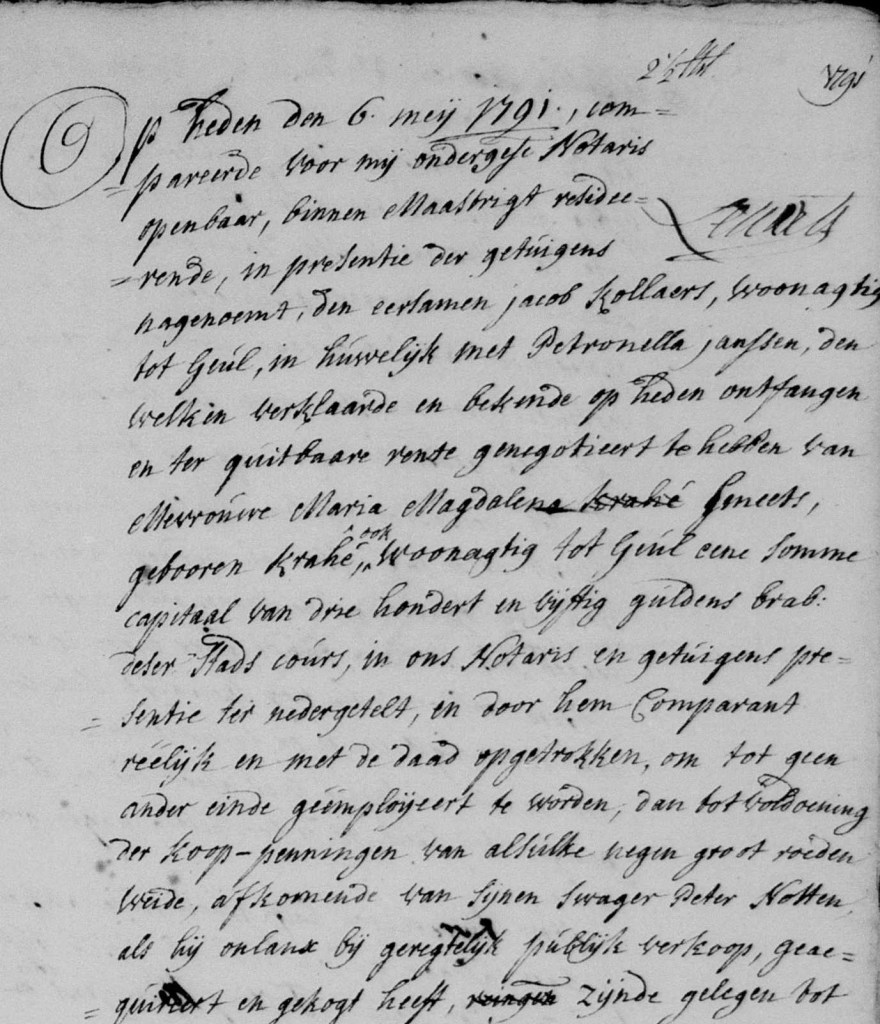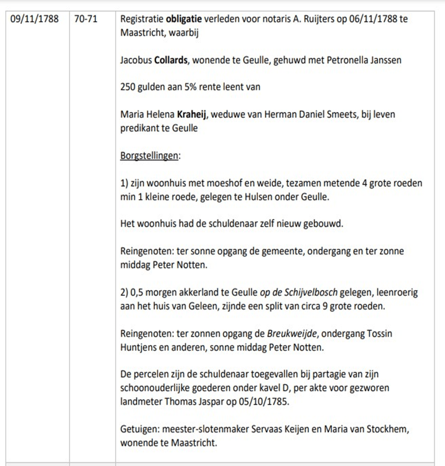 Wat de naam ‘Collard’ betreft het volgende. Jacob Collard moest vanuit Geulle naar Nerem om een erfenis van zijn overleden zus ophalen en door de daartoe opgemaakte akte werd zijn naam bekend / duidelijk. Later zal hij nog een keer de weg naar Nerem moeten maken voor een verkoop op 13 november 1785 in Nerem . Ik heb niet alle gichtregisters vertaald deze uit Nerem dus niet.
