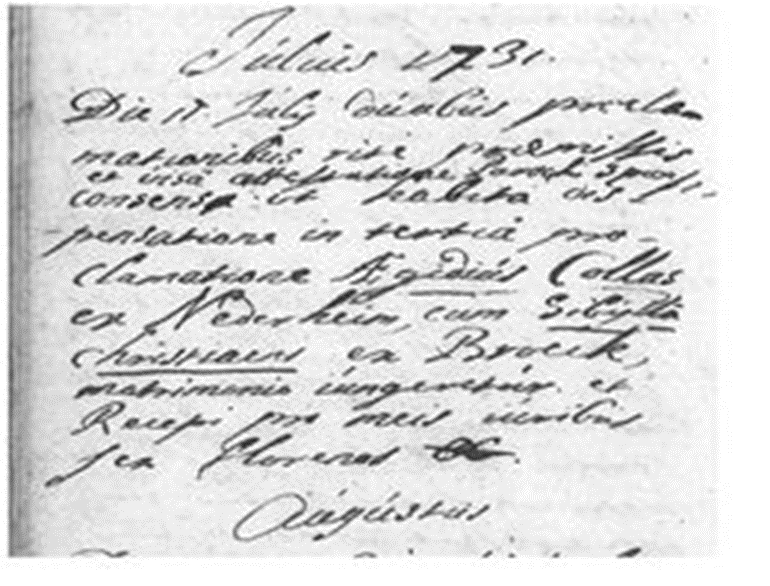 Julius 1731. Die 11 julij duobus proclamationibus rite praemissis et visae attestatione parochi sponsi consenso ut habita dispensatione in tertiae proclamatione Aegidius Collas ex Nederheim, cum Sibijlla Christiaens ex Broeck, matrimonio iungeretur et recepi pro meis iuribus sex florenos bb. Vertaling: Op 11 juli 1731, na twee vooraf gedane afroepingen en met de toestemming van de pastoor van de bruidegom, alsook met vrijstelling van de 3de afroeping, werd Aegidius Collas uit Nerem met Sibijlla Christiaens uit Broeck door het huwelijk verbonden en ontving ik voor mijn rechten 6 brabantse gulden