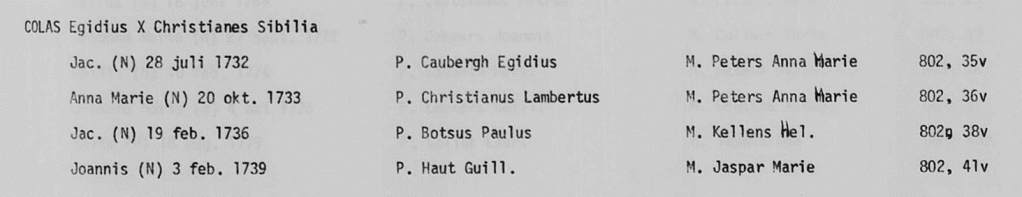 Hierboven een fragment uit de moderne klapper van het parochieregister van Vreren (met ook personen uit Nerem), gemaakt door het Rijksarchief te Hasselt, met de dopen van de kinderen van Gilles Collas en Sibilia Christianes.