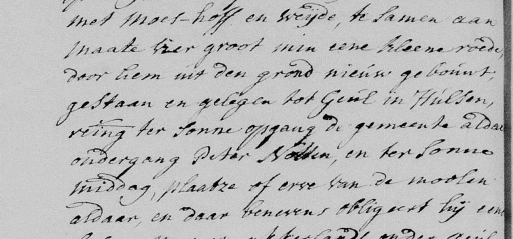 waer aff het eerste is aenhaldende aen maete vijfftig cleen roeden. Reijgen(o)ten: ter eenre d’erffgen(amen) Oersfelt, ter andere zijde de wed(uw)e Marten Boovens.