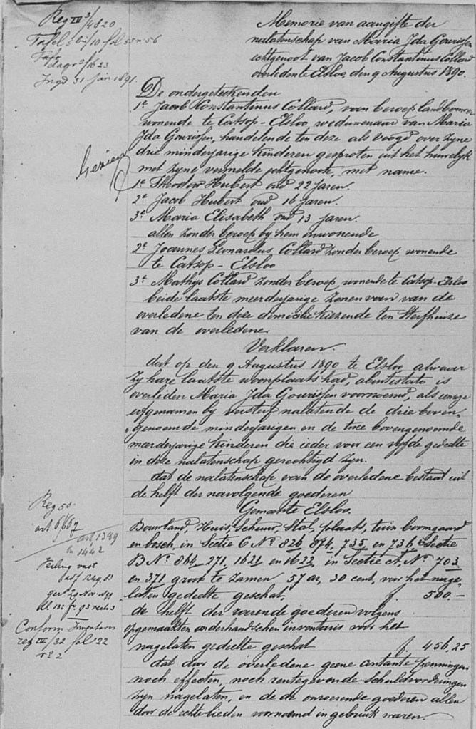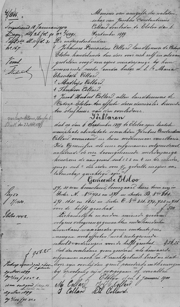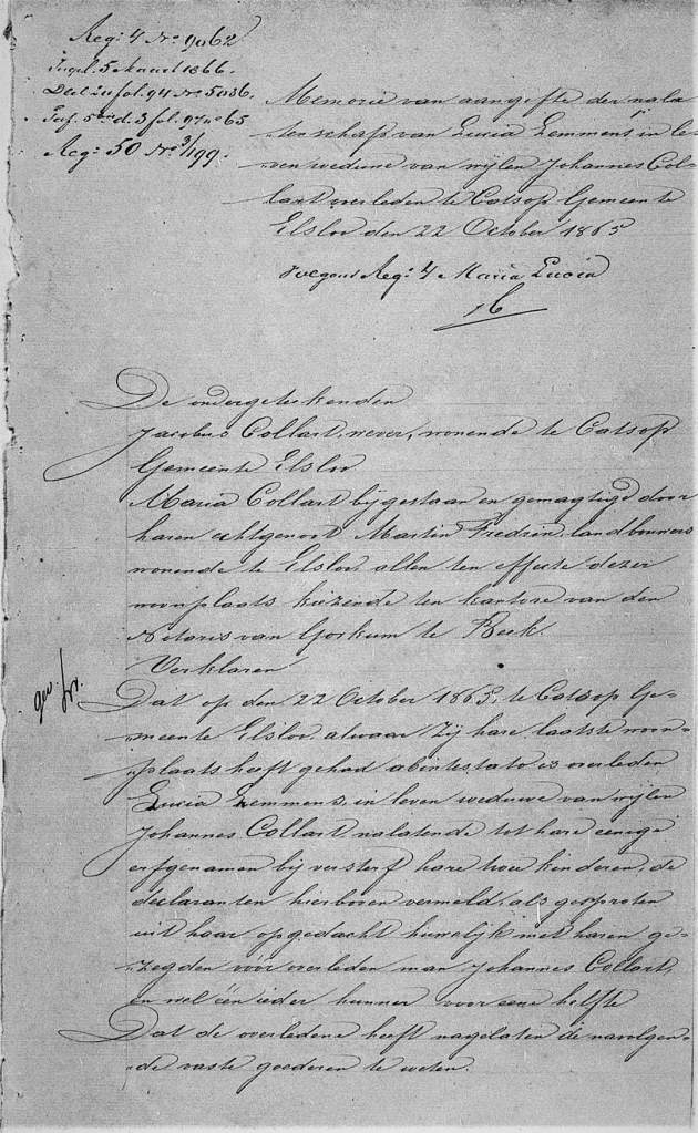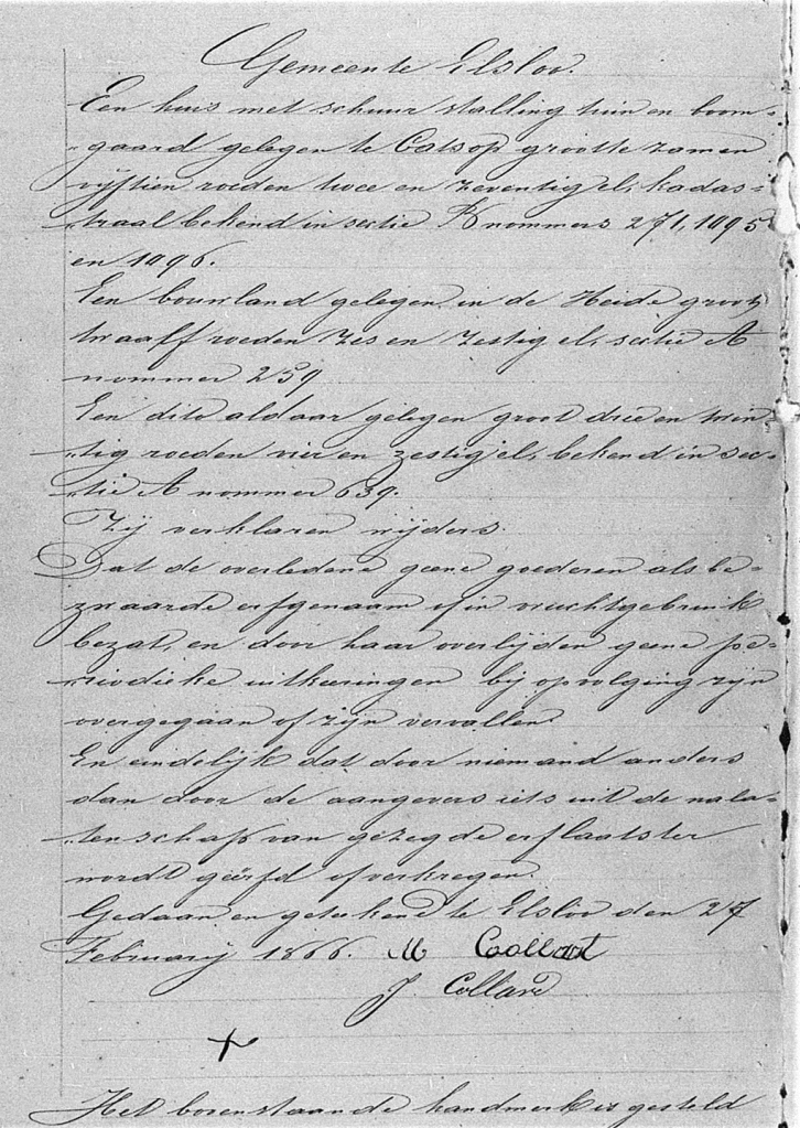 Hieruit valt o.m. af te leiden dat Marie Elisabeth Collard ‘Marie’ genoemd wordt en met, zoals eerder vermeld, met haar nieuwe echtgenoot niet meer hier woonde maar in Elsloo. Petronella haar zus overleed in 1864 en staat hier niet meer op. Jacobus Collard wordt als nieuwe eigenaar aangegeven. Het is niet duidelijk wie wat verkrijgt. Wel dat het kadasternummer B271 niet wijzigt, dus gedurende een lange tijd is deze boerderij niet veranderd. Martin Frederix vond het nodig dat deze akte opgemaakt werd bij notaris Gorkum in Beek. En hij had om een getuigen gevraagd die hebben ondertekend voor hem. We weten dat Marie Collard straks twee percelen krijgt.
