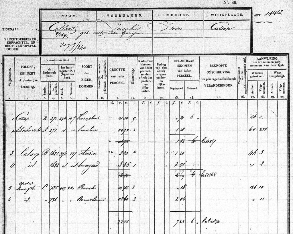 Bovenstaand de eerste kadasterlegger t.n.v. Jean Collard. Hij overleed in  1858, zijn echtgenote Lucie in 1865; om die reden staan er al zijn erfgenamen op. B 1095 en 1096 worden gesplitst; opgedeeld tussen zijn dochter en zijn zoon en omgenummerd tot B1619 en B1620 voor Marie Elisabeth en voor Jacob B1621 en B1622 en de woning.