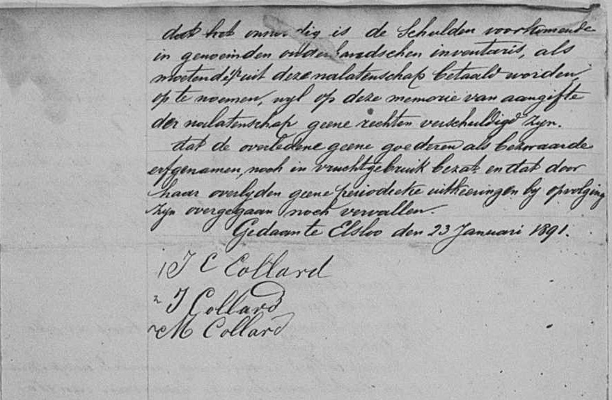 M.V.S. van Jacob Kollard en gelijk zien we dat het huis al bewoond is door Joannes Collard en zijn zus Maria Elisabeth woonde nog bij hem. Hier is wel een notariële akte van maar ik heb ze nog niet en zal later nog als aanvulling komen. Maar ieder krijgt zijn deel en Sjengske Collard blijft hier wonen.