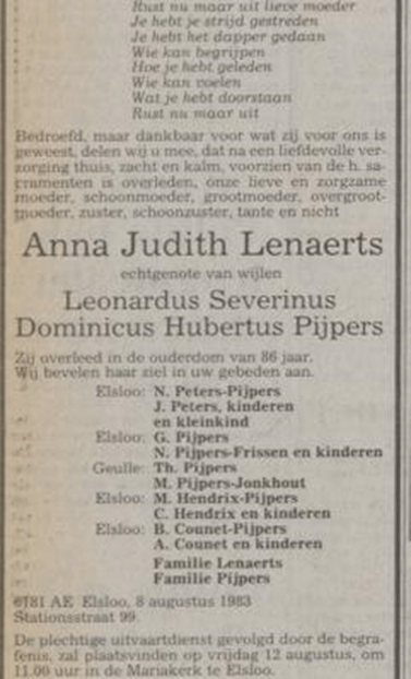 Wat betreft de andere familieleden van Laurens Penders en Cornelia Kindelein: een van haar dochters, Cornelia Penders, woonde in Elsloo. Zij trouwde daar, maar verhuisde later naar Maastricht, waar ze haar leven deelde met haar echtgenoot, Servaas Lemeer. Cornelia bereikte de respectabele leeftijd van 71 jaar. De oudste dochter, Elisabeth Penders, geboren in 1819, overleed helaas al in 1850 in Catsop.