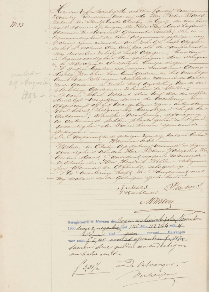 Laurens is overleden in zijn huis in Catsop. De betrokkenen konden niet schrijven en dus ook niet tekenen. De akte werd ondertekend door burgemeester L. Van Hees, die destijds in Catsop woonde.