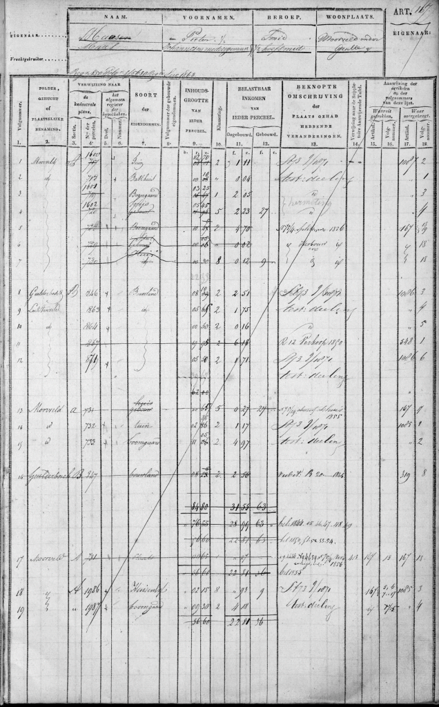 De Oorspronkelijk Aanwijzende Tafels (OAT’s) van 1833 vormen een cruciale bron van informatie binnen het Nederlandse kadaster. Deze tabellen, samen met de bijbehorende minuutplans, werden opgesteld na metingen en kaarten die landmeters al voor 1832 maakten. Het kadaster had tot doel om alle percelen in Nederland nauwkeurig in kaart te brengen en te registreren. Dit was een belangrijke stap in de ontwikkeling van een systematisch en betrouwbaar systeem voor het beheer van landbezit en belastingheffing.