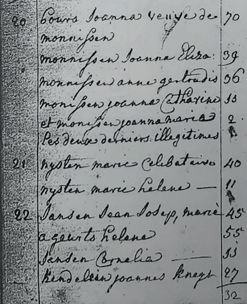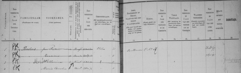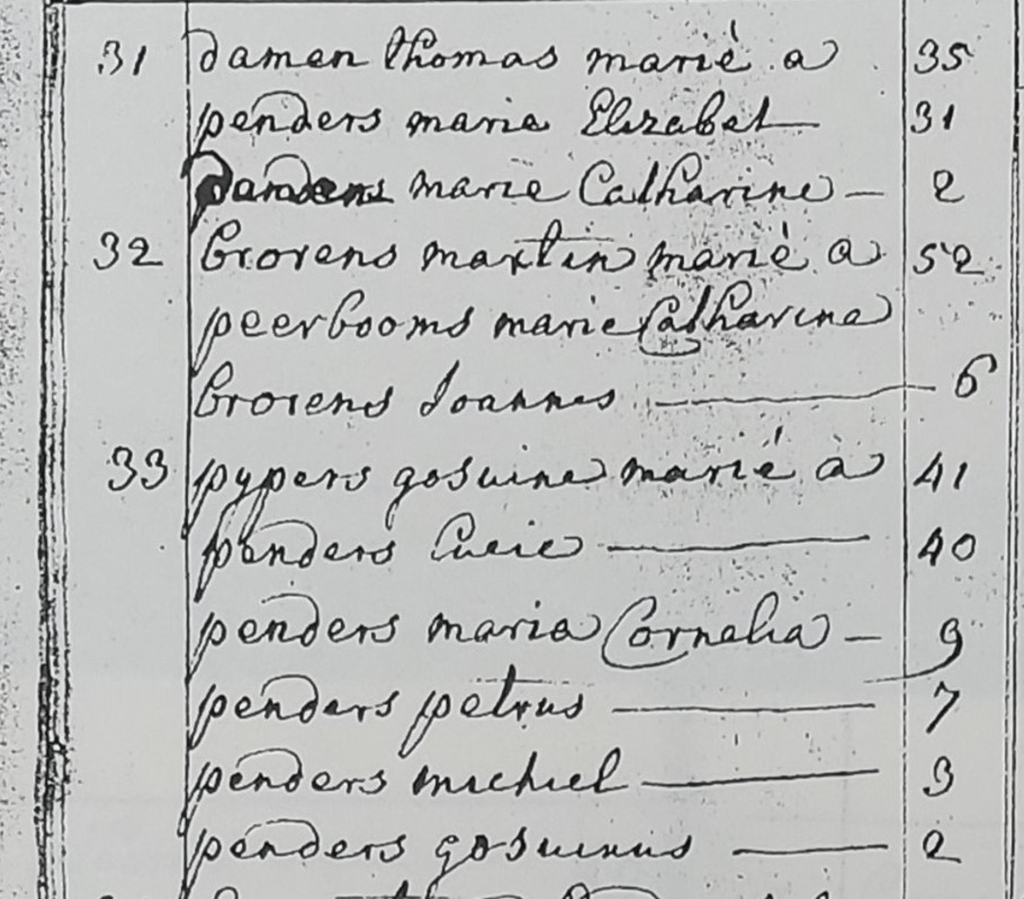 De bevolkingslijst uit 1825 is genoteerd, maar gezien de leeftijden van sommige personen, heb ik mijn twijfels. Desalniettemin beschikken we over een lijst. Op nummer 30 worden als eerste Laurens Penders en zijn echtgenote Cornelie Kindelein geteld, samen met de kinderen Johannes en Maria Catharina.