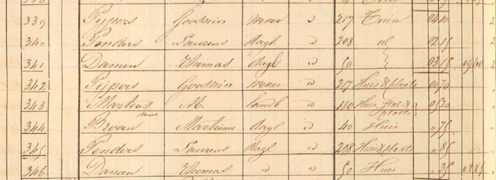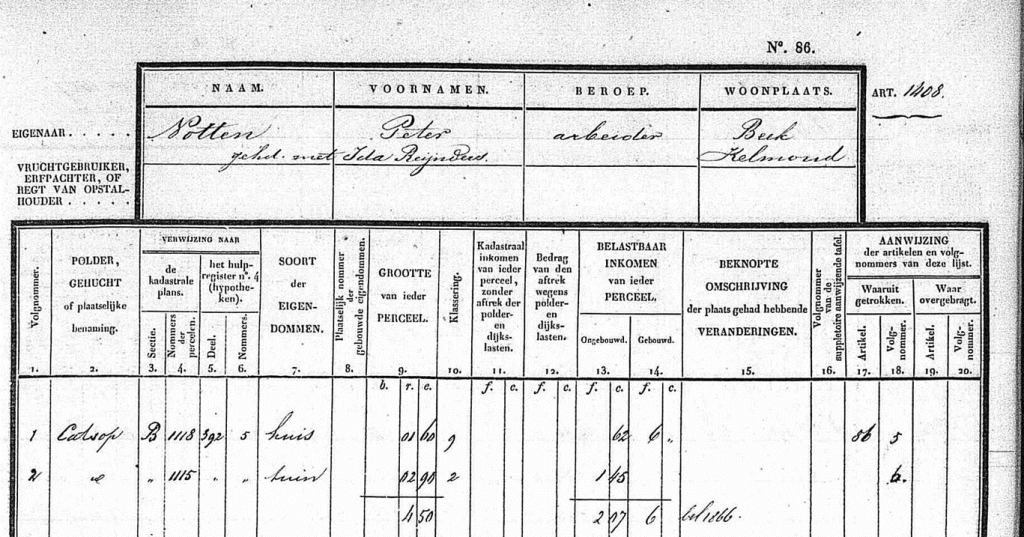 Laten we vervolgens de woonplaats van Laurens in 1833 nader onderzoeken met behulp van het oude kadaster. Het kadaster, met name de Oorspronkelijk Aanwijzende Tafel (OAT) en de Supplementair Aanwijzende Tafel (SAT) uit die periode, biedt waardevolle informatie over eigendomsregistraties. In 1833 werden deze documenten gebruikt om land en eigendommen officieel te registreren, inclusief de toewijzing van kadasternummers. Door Laurens’ leeftijd te vergelijken met de geregistreerde data, kunnen we een beter beeld krijgen van zijn verblijfplaats. Als Laurens in 1791 geboren is en in 1820 29 jaar oud was, zou dit erop kunnen wijzen dat hij al enkele jaren op dezelfde locatie woonde voordat de kadasternummers officieel werden toegewezen in 1833.