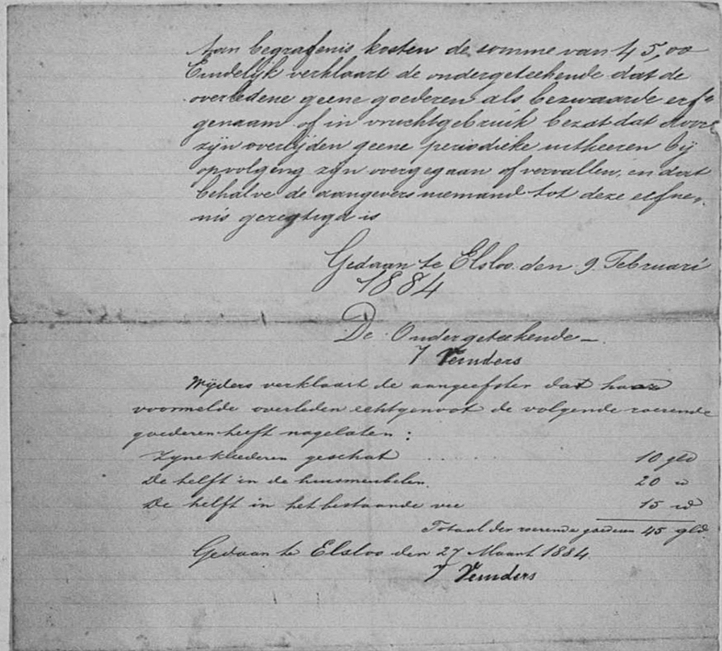 Op de twintigste september in het jaar 1846 verscheen Hendrik Penders, een 26-jarige dagloner wonende te Catsop, gemeente Elsloo. Hendrik was de zoon van Laurens Penders, die landbouwer was in Catsop. Ook verscheen Hendrik Claessen, een landbouwer die zich als buurman van Laurens had opgegeven, hoewel hij iets verderop op Den Dries woonde en waarschijnlijk niet zijn directe buurman was. Verder stonden de ouders van Laurens en zijn echtgenote Cornelie Kindelein, op dat moment 54 jaar oud, geboren en woonachtig in Catsop, vermeld op de akte.