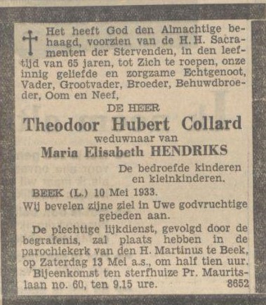 Henricus Conrardus Smeets is geboren op 12-05-1894 in Elsloo, (Stein), Limburg, Nederland, zoon van Jan Mathias Smeets en Margaretha Schutjens. Hij is gedoopt op 12-05-1894 in Elsloo, (Stein), Limburg, Nederland. Henricus is overleden op 21-05-1928 in Elsloo, (Stein), Limburg, Nederland, 34 jaar oud. Hij is begraven op 21-05-1928 in Elsloo, (Stein), Limburg, Nederland. Henricus trouwde, 25 jaar oud, op 13-04-1920 in Elsloo, (Stein), Limburg, Nederland met Mathilda Maria Hubertina Beckers, 27 jaar oud. Het kerkelijk huwelijk vond plaats op 17-04-1920 in Elsloo, (Stein), Limburg, Nederland. Mathilda is geboren op 18-11-1892 in Elsloo, (Stein), Limburg, Nederland, dochter van Theodoor Hubert Beckers en Maria Elisabeth Lenaerts. Zij is gedoopt op 18-11-1892 in Elsloo, (Stein), Limburg, Nederland. Mathilda is overleden op 11-05-1928 in Elsloo, (Stein), Limburg, Nederland, 35 jaar oud. Zij is begraven op 11-05-1928 in Elsloo, (Stein), Limburg, Nederland.